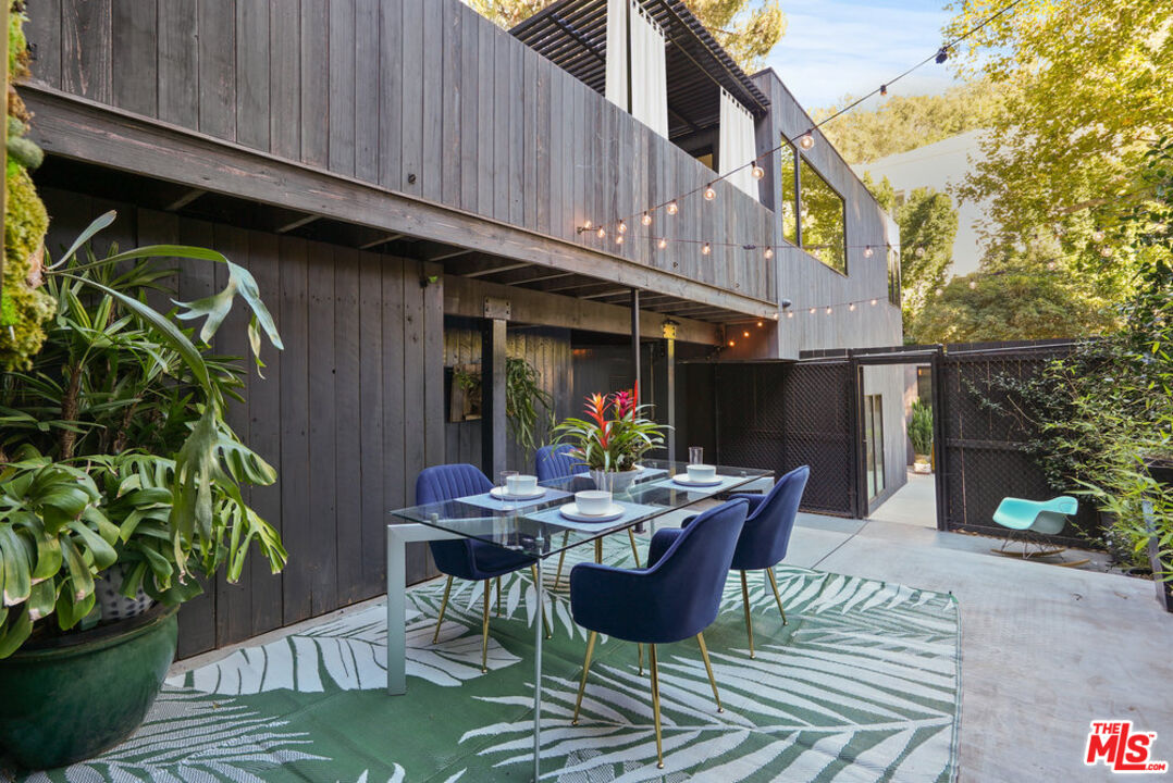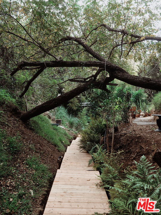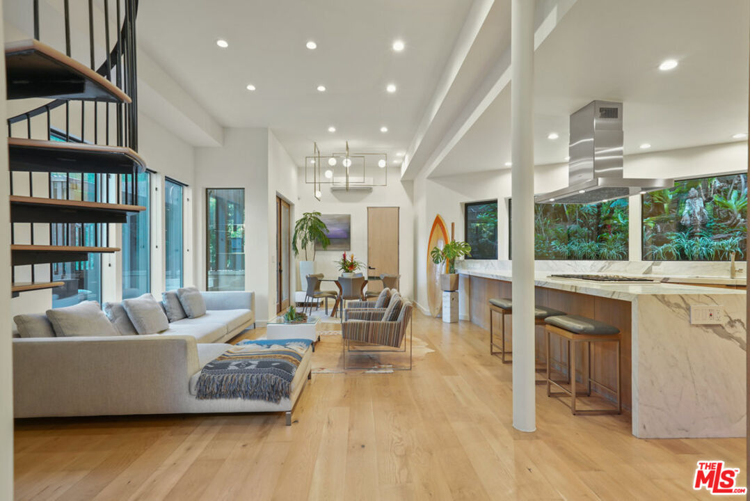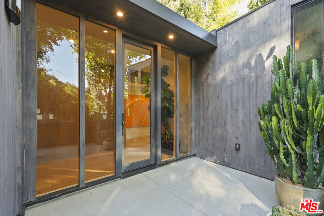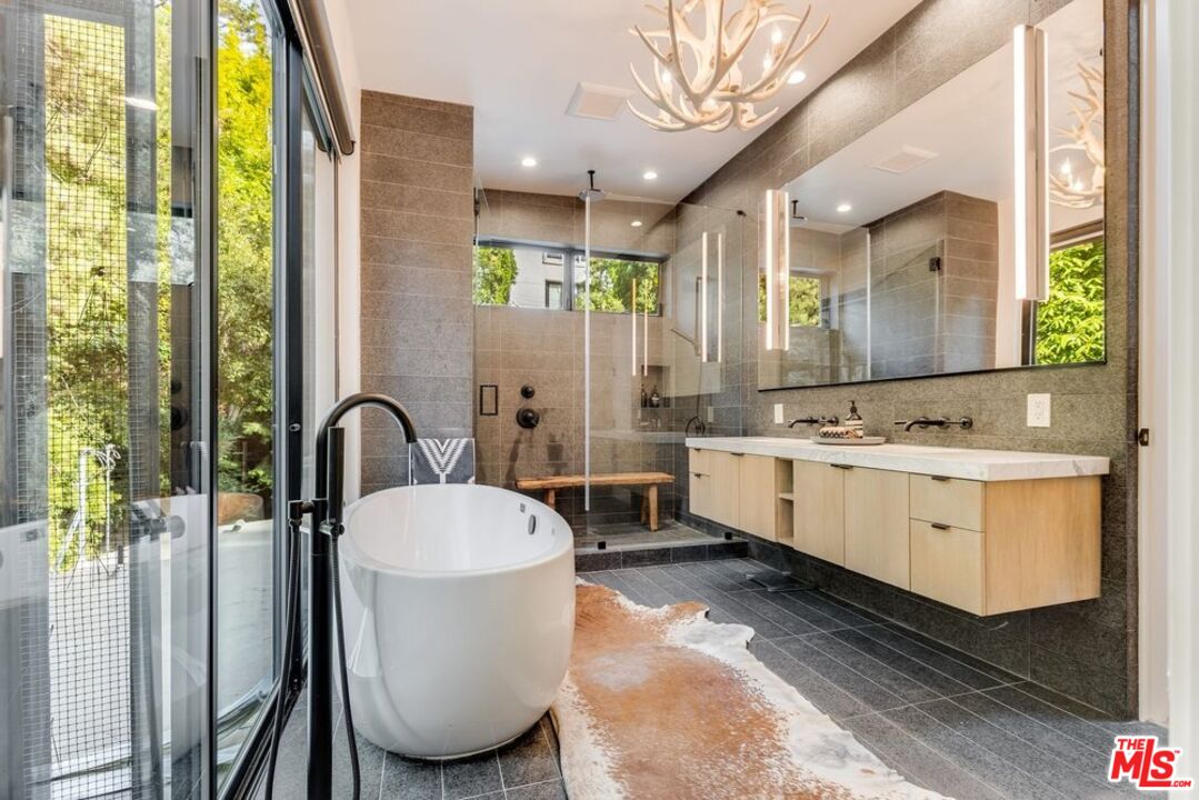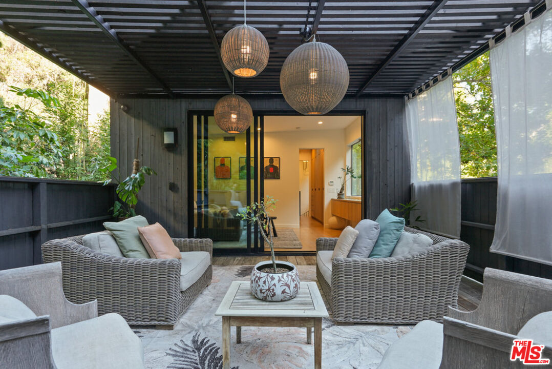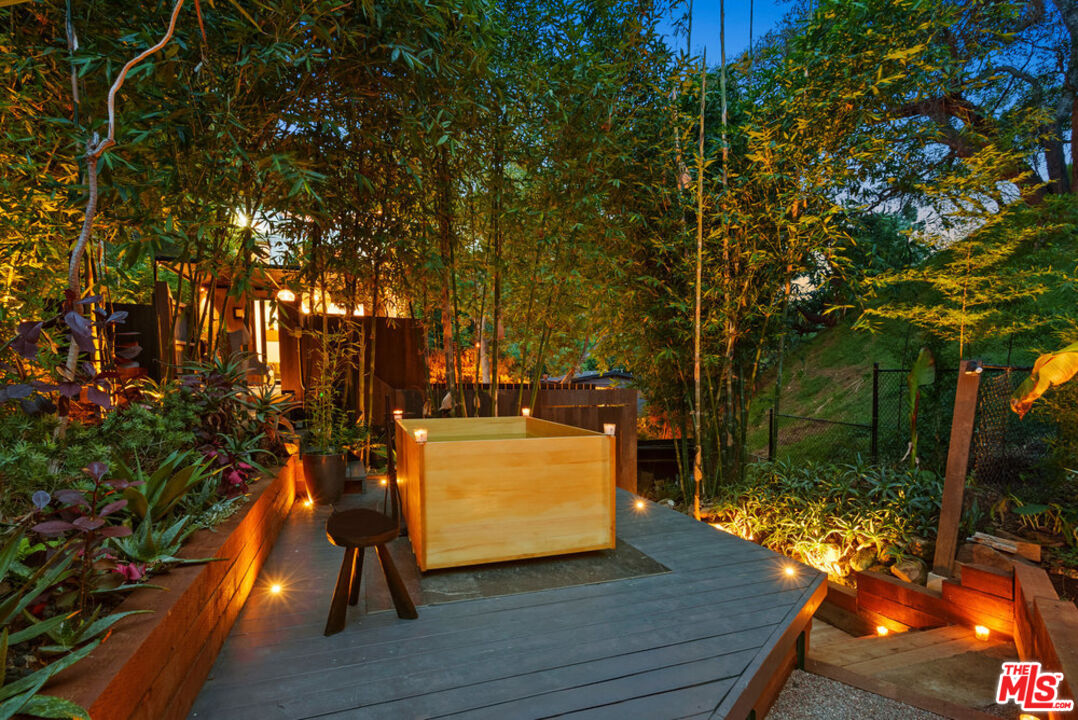 Meticulously renovated in 2017 by globally acclaimed architect Alex Pettas, AIA formerly of Marmol Radziner, this Wabi-Sabi inspired residence seamlessly blends nature with refined living. Experience the harmonious connection with the outdoors through abundant indoor-outdoor living spaces. Admire the solid white oak floors that grace the interior. Feast on the gourmet kitchen, adorned with its waterfall edge Carrera marble. Bask in wall-to-wall windows while enjoying views of a rare and tropical plant collection. The focal point of the dining room, a sculptural chandelier from the prestigious Italian design house Venice M, creates an exquisite atmosphere. Adjacent is a wine room, leading to a spacious patio perfect for enchanting alfresco dining amidst the alluring scent of trailing jasmine. Beyond the living room, the first floor offers two bedrooms and a bathroom showcasing Ann Saks tile and FRANKE fixtures, setting the tone for luxurious living. Ascend the steel spiral staircase to discover the primary suite, featuring two walls of custom oak closets that artfully disappear, embodying a simple yet elegant aesthetic. Unwind in the sophisticated soaker tub, complete with Airbath system jets and finished with fixtures by esteemed designer Jason Wu. The bedroom, with panoramic garden views, beckons relaxation and draws the eye out through accordion-style sliding glass doors. Once fully opened, immerse yourself in the expansive deck crafted from Ipe wood, complete with a private outdoor shower. Explore the permaculture-designed garden, where mature fruit trees, including citrus, apricot, plum, taro, and assorted berries, thrive. The western portion of the lush tropical landscape, bordered by giant timber bamboo, provides privacy and hosts an Alaskan white oak Japanese Ofuro tub designed by renowned artisan Andrew Brant. This natural sanctuary is the pinnacle of refined living that's seamlessly integrated with nature. Fully-furnished. Small pets okay.